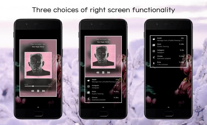 – Right screen: Three variations of the right panel are included: A music-focused panel, a notification-focused panel, and a hybrid of both.
