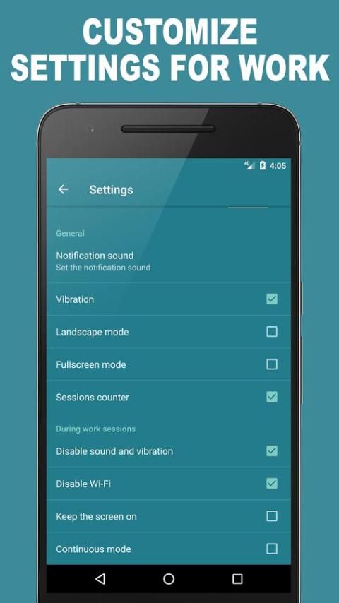 Menyetel berapa lama Anda harus bekerja, mengatur sendiri beberapa istirahat pendek untuk memecah itu dan kemudian istirahat yang lebih besar setelah waktu yang lama. Selama waktu kerja Anda aplikasi dapat menonaktifkan pemberitahuan, suara dan wifi.
