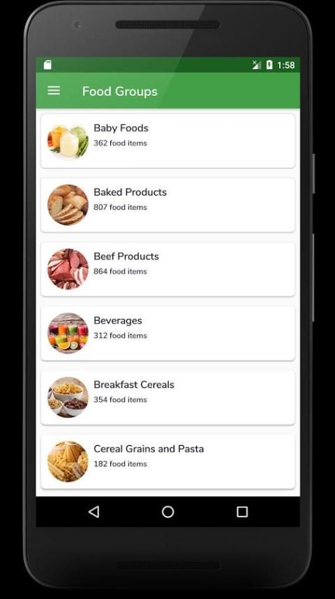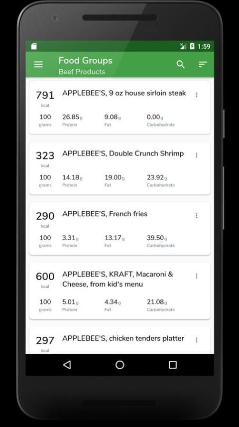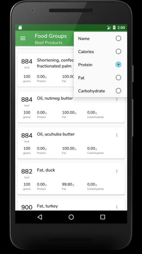 • Cari & mengurutkan makanan dengan nama, kalori, protein, lemak atau karbohidrat.
