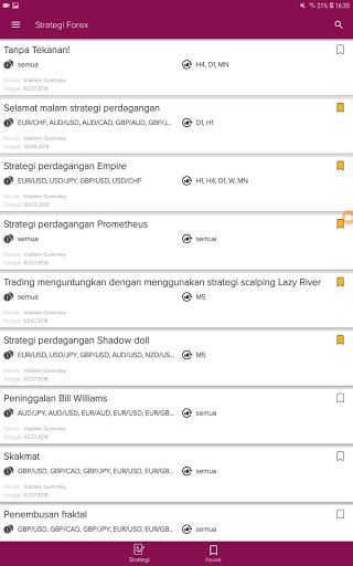 Kami hanya mendapatkan informasi yang paling berharga dan berguna untuk Anda. Deskripsi strategi didasarkan pada pengalaman berlatih pedagang dan analis, jadi tidak ada yang berlebihan di sini. Tidak ada pelajaran panjang dan webinar. Akses gratis ke strategi nyata dengan pembaruan harian, dan pencarian cepat.