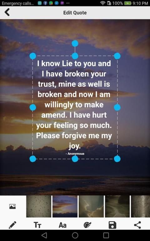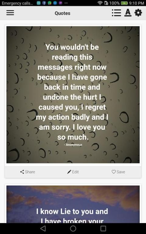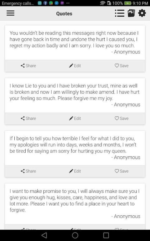 Ini adalah App yang menyimpan banyak kutipan yang bagus untuk mengatakan maaf kepada seseorang yang Anda cintai. Saya akan terus menambahkan kutipan baru tepat waktu. Ada banyak Forgive Me Quotes yang dapat Anda kirim ke seseorang yang Anda cintai.