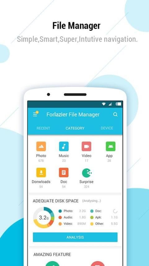 ForLazier File Manager (Explorer) cerdas menganalisis penggunaan penyimpanan, mendeteksi file besar, file redundansi, dan baru-dibuat file.