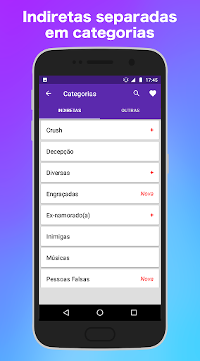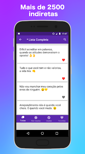 Dengan aplikasi frasa tidak langsung Anda akan memiliki tidak langsung untuk semua kasus, dengan kumpulan kalimat yang dipisahkan oleh kategori, menjadi cinta tidak langsung, naksir, penindasan, teman palsu, musuh, mantan pacar, meloka, musik, pembalut, berat, tertekan, antara lain , Untuk menyalin frasa tidak langsung dan digunakan sebagai status whatsapp, telegram dan berbagi di facebook, cerita instagram, tumblr, dll.