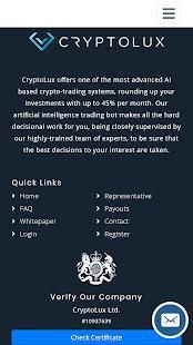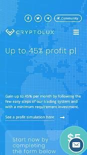 CryptoLux menawarkan salah satu sistem kripto-perdagangan yang berbasis AI yang paling maju, mengumpulkan investasi Anda sampai dengan 45% per bulan. buatan bot perdagangan intelijen kita membuat semua kerja putusan keras untuk Anda, yang diawasi ketat oleh tim kami sangat terlatih ahli, untuk memastikan bahwa keputusan terbaik untuk kepentingan Anda diambil.