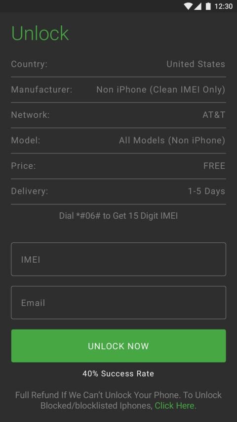 Gratis Factory IMEI membuka kode untuk Non-iPhone (Android) untuk AT & T. Gunakan opsi di tengah menu utama untuk memesan layanan gratis. Tingkat keberhasilan layanan gratis berubah setiap hari. Tingkat keberhasilan akan ditampilkan selama proses pemesanan Anda.