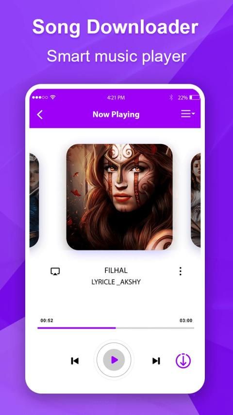 ♫ Pemutar Musik yang Bergaya, Kuat dan Cepat dengan desain elegan dengan fungsi Free Music Downloade & Song Downloader.