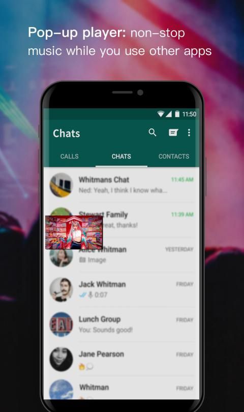Dengarkan musik gratis YT dengan pemutar mengambang saat mengirim SMS, mengobrol, bermain game, dan aplikasi lainnya.