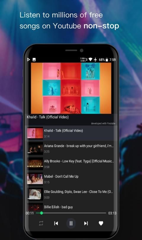 Listen to YT free music with a floating player while texting, chatting, gaming, and any other apps.