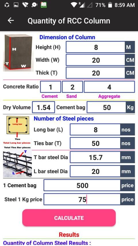 Hitung volume untuk beton Kolom RCC ... Juga masukkan jumlah dan harga untuk menghitung total volume dan biaya bahan saat Anda memasukkan harga per kaki kubik, harga per Meter kubik, atau harga per meter kubik.