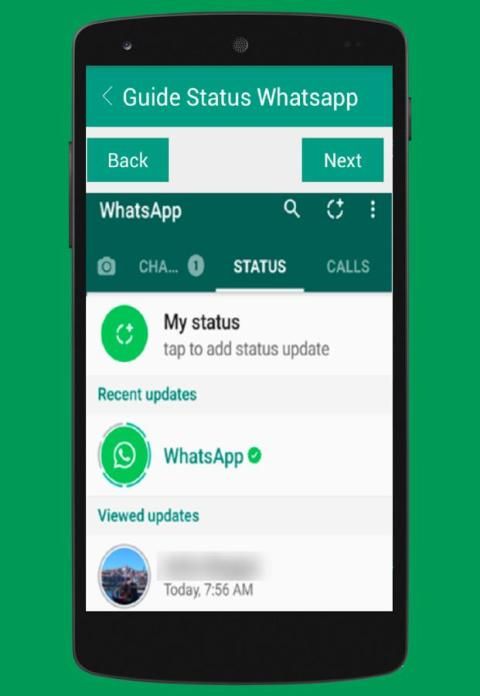Berikut ini adalah panduan yang bagus tentang cara menggunakan status di whatsapp.In ini pertama Anda pertama kali akan melihat pembaruan Anda sendiri di bar hijau. Di bawah itu, Anda dapat melihat update baru teman dan update dilihat.