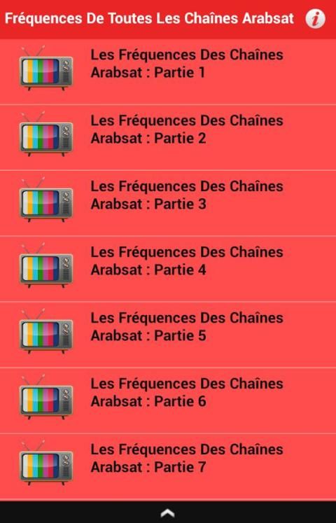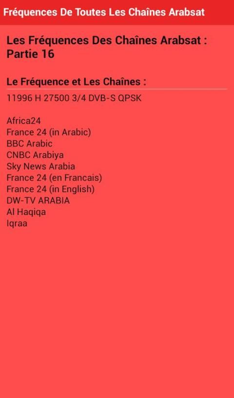 Frekuensi Semua Saluran Arabsat adalah aplikasi gratis baru yang berisi semua frekuensi dari semua Saluran satelit Arabsat (Badr 4, 5 Badr Badr Badr 6 dan 7 [26º East]). Aplikasi ini berisi frekuensi saluran Arab seperti Maroko, Tunisia, Aljazair, Bahrain, Mesir, Arab Saudi, Irak, Qatar, Sudan, Palestina, Suriah, Oman, Libya , Libanon, Yordania, UEA, Kuwait pada satelit Arabsat (Badr 4, 5 Badr Badr Badr 6 dan 7) dan juga rantai negara-negara Eropa seperti Perancis, Italia, Jerman, Belgia pada Arabsat (Badr 4, 5 Badr Badr Badr 6 dan 7).