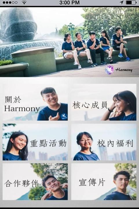 Dalam aplikasi ponsel ini, termasuk profil anggota Harmony, menjelaskan kegiatan utama dari mitra (antar-sekolah dan toko-toko) informasi mengenai kebijakan sekolah untuk memperbaiki isi video dan lebih untuk memberikan umpan balik anonim, tanggal acara sekolah fungsi. Sehingga siswa memiliki pemahaman yang lebih dalam Harmony, tetapi juga untuk memungkinkan siswa untuk kehidupan kampus lebih nyaman. Lihat sungguh-sungguh kami, merasakan ketulusan kami!