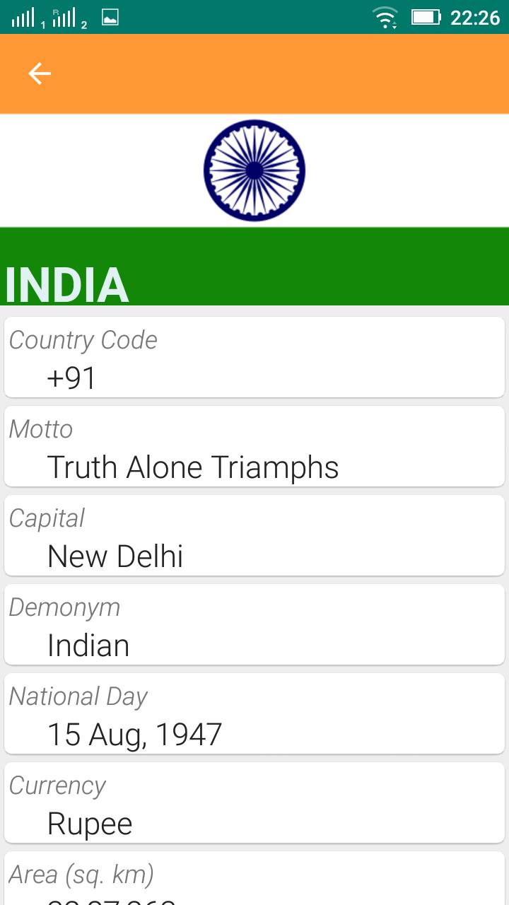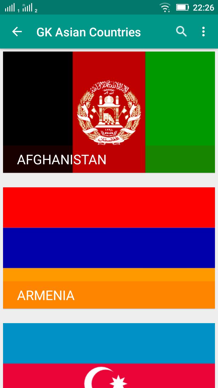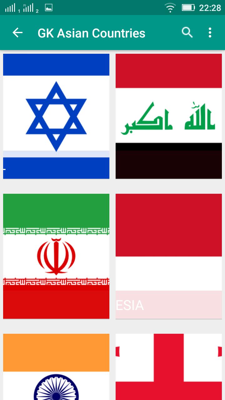 GK Asian Countries is an informative application consisting Flags, Country code, Motto, Capital, Demonym, Independence, Currency, Area, Population, Domain, Language, Sport, Animal, Bird, Flower, Fruit of all Asian countries.