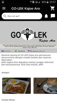 GO-LEK Kajoe Aro Adalah Aplikasi Pemesanan secara online yang ada diwilayah khususnya kayu aro, kabupaten kerinci, provinsi jambi yang menyediakan berbagai kebutuhan sehari-hari yang dapat dipesan dengan menggunakan aplikasi GO-LEK Kajoe Aro.