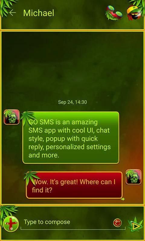 Periksa GO SMS tema terbaru kami: GO SMS Rasta Weed! Khusus diciptakan untuk GO SMS, kita membawa warna ke dunia SMS Anda!