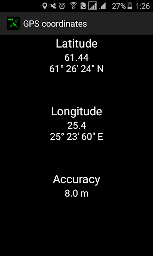 GPSCoordinates is an application for determining the coordinates of your location. The coordinates are displayed in the latitude and longitude systems. The Accuracy parameter displays the accuracy of the determination in meters.