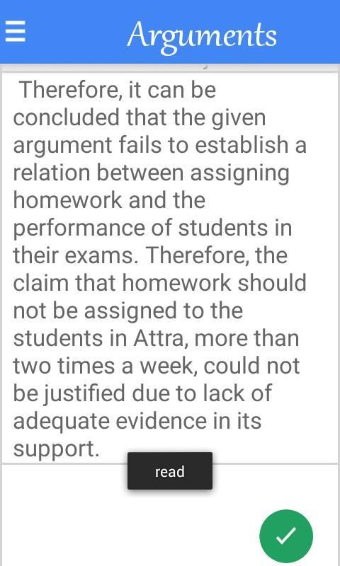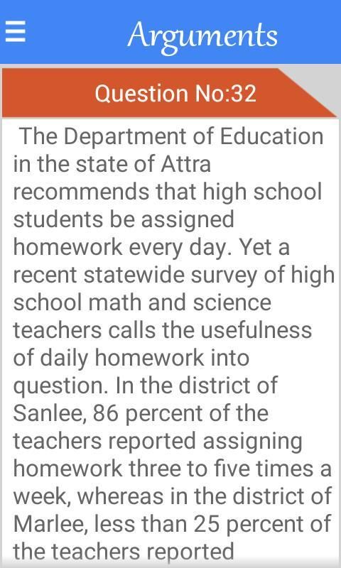 Aplikasi ini berisi 50 tugas masalah dan 50 argumen untuk mempersiapkan gre bagian AWA dengan instruksi yang tepat ....