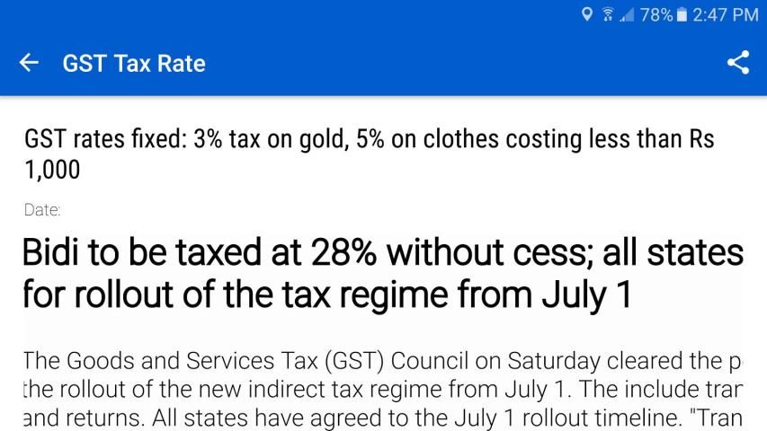 Aplikasi ini menyediakan berita terbaru dan artikel tentang update mengenai Tarif Pajak GST di India. Dengan tindakan Pajak GST mengubah undang-undang pajak di India, bisnis perlu menyadari perubahan dan langkah-langkah yang mereka butuhkan untuk mengambil selama masa transisi. Kami menyediakan berita terbaru tentang GST melalui berbagai situs. Juga, memberikan bantuan pendaftaran GST dan pedoman.