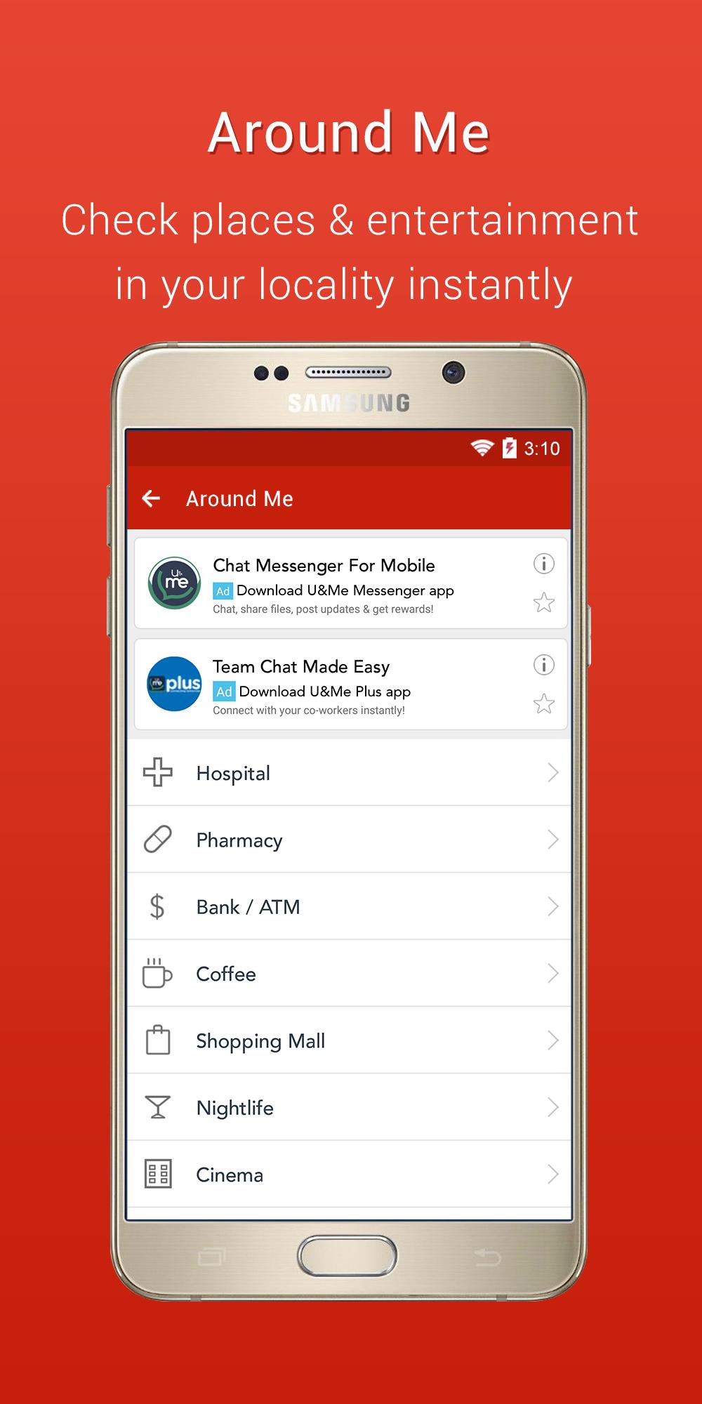 Around Me: Find the places around you including restaurants, malls, coffee shops etc.