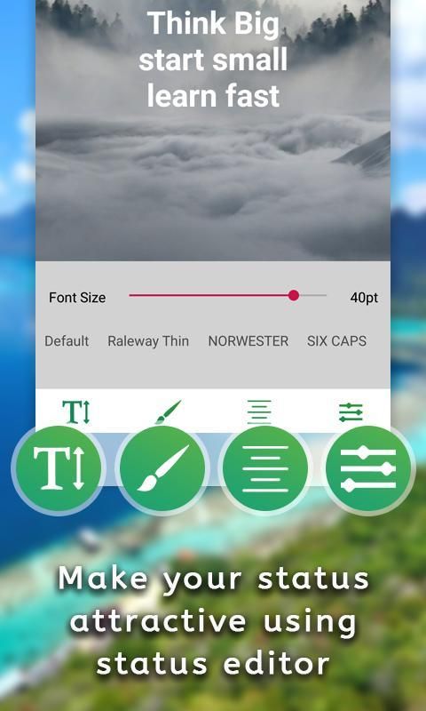 Galeri Penghemat Status & Pengunduh - Editor Status memungkinkan Anda untuk Membuat Status secara gratis dari berbagai kategori, menambahkan teks pada status, mengubah font teks, menambahkan fitur bayangan dan blur ke status dan menyimpan & berbagi status yang diedit dengan siapa pun di jejaring sosial gratis.