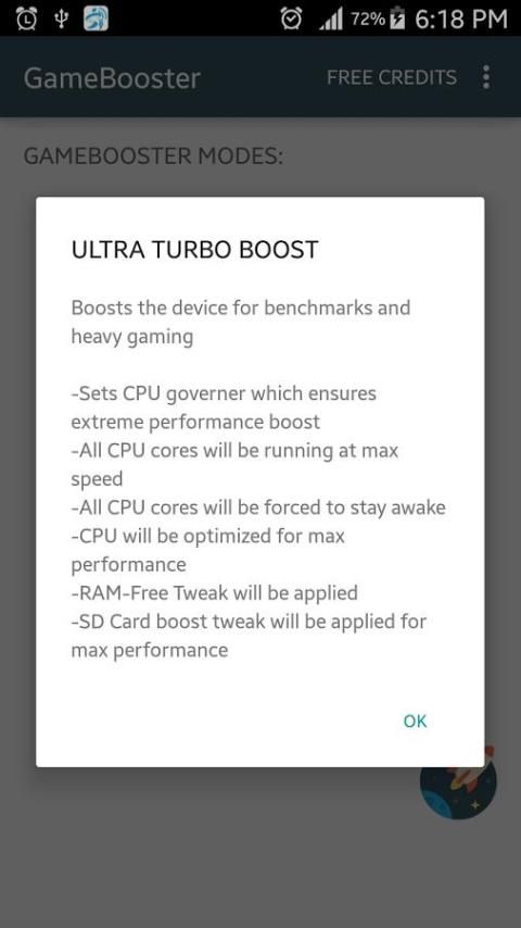 Ultra Turbo Boost mode di aplikasi ini meningkatkan perangkat untuk benchmark & game berat. Ini menetapkan Gubernur CPU & memastikan semua core berjalan pada kecepatan maks. RAM-Free Tweak & SD Card Meningkatkan Tweak juga diterapkan untuk kecepatan maksimum. Ini mempercepat perangkat 30% atau bahkan lebih.