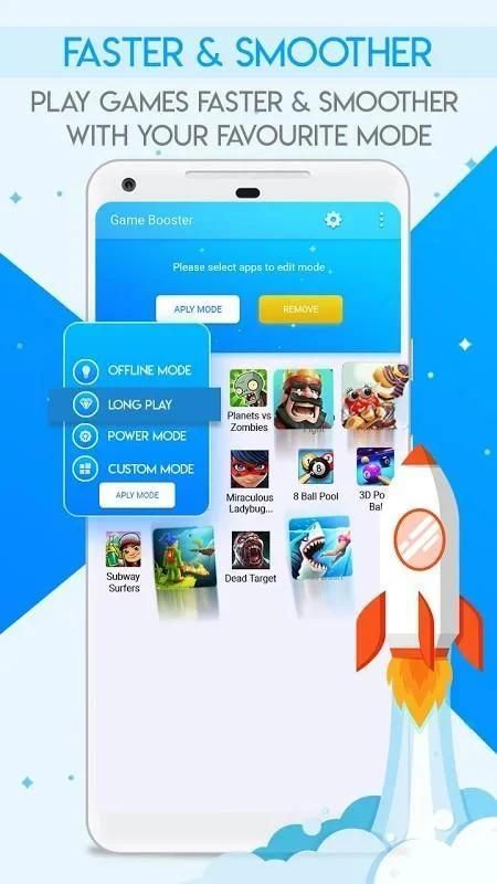 Game Booster - Speed Up Phone is an extremely powerful tool to play your Android game in an optimal performance. Game Booster frees up your phone memory & close unused apps/tasks to boost best environment for your Android Game play. This app also features "Game Mode" where you can choose to apply specified phone environment for your game.