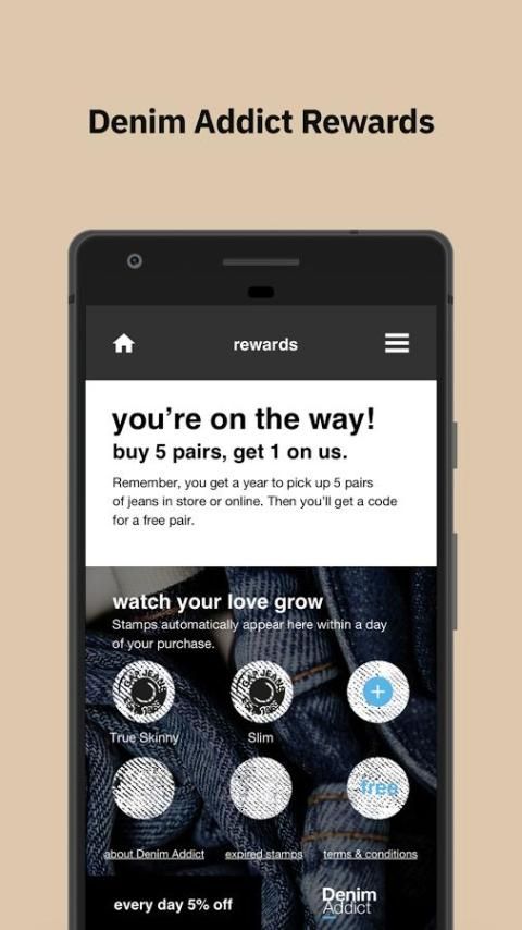 Imbalan bagian dari aplikasi sekarang fitur Denim Addict. Dapatkan cap di bagian + imbalan Gap Anda untuk setiap pasangan penuh Perempuan harga atau celana jeans Pria Anda membeli di toko atau online. Kumpulkan 5 perangko dalam setahun untuk mendapatkan sepasang bebas jeans Wanita atau Pria bernilai sampai £ 50 / € 65 *.