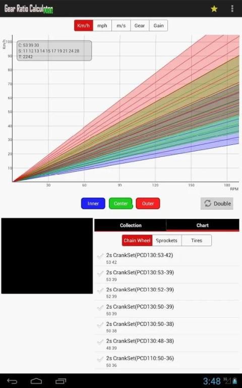Kombinasi dari 22 jenis rantai roda, 39 jenis sprocket dan 70 jenis ban - Buat grafik rasio gigi dan kecepatan-irama.