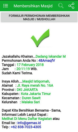 Dapat Melihat Kegiatan Memakmurkan Masjid Seluruh Indonesia dan Juga dapat Mengajukan Permohonan Membersihkan Masjid Secara Online Lewat Mobile Phone Dan Menerima Notifikasi Secara Keseluruhan.