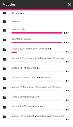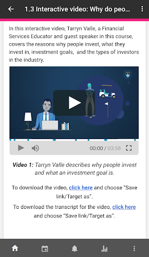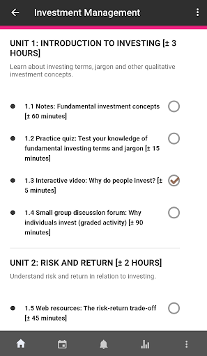 ● Lacak kemajuan kursus Anda: periksa penyelesaian kemajuan dalam kursus untuk modul Anda dan lihat nilai Anda untuk setiap aktivitas bertingkat.
