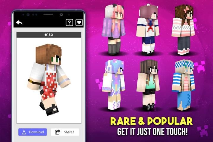 Jangan hentikan pemilihan hanya satu kulit, mengapa sekarang memilih dan chage skin Girl sesering mungkin. Aplikasi kami akan menambahkan banyak skin Girl untuk minecraft dengan desain profesional yang dapat Anda ubah setiap hari secara gratis. Coba instal skin Girl kami untuk pengalaman MCPE Minecraft Pocket Edition tidak akan sama ... lebih menyenangkan dan tidak pernah membosankan.