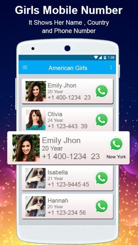 Girls Mobile Numbers:Search Girlfriend will help you easily find any girls conatct Numbers which is very difficult.So download our app and Enjoy chatting with different girls from any country of world.This app will only show the listed countries Girls Mobile Numbers.