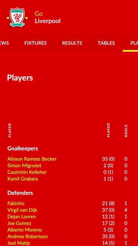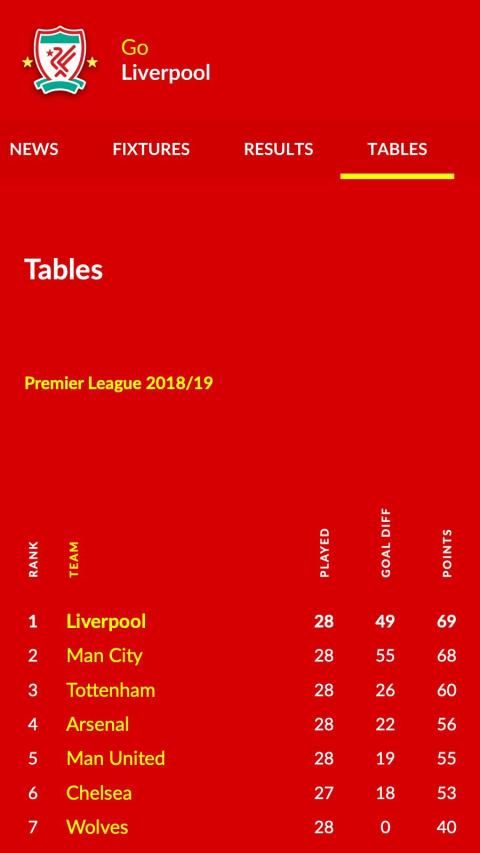 • Tabel liga yang diperbarui dan mudah dibaca.