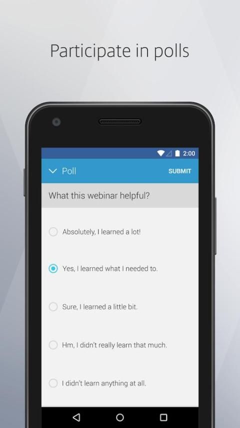 Berada jauh dari komputer Anda tidak berarti Anda harus kehilangan acara online. Aplikasi seluler GoToWebinar gratis memungkinkan Anda tidak hanya melihat dan mendengar webinar, tetapi mengambil bagian di dalamnya juga. Tidak peduli di mana Anda berada, Anda dapat mengajukan pertanyaan, mengambil bagian dalam jajak pendapat dan lebih.