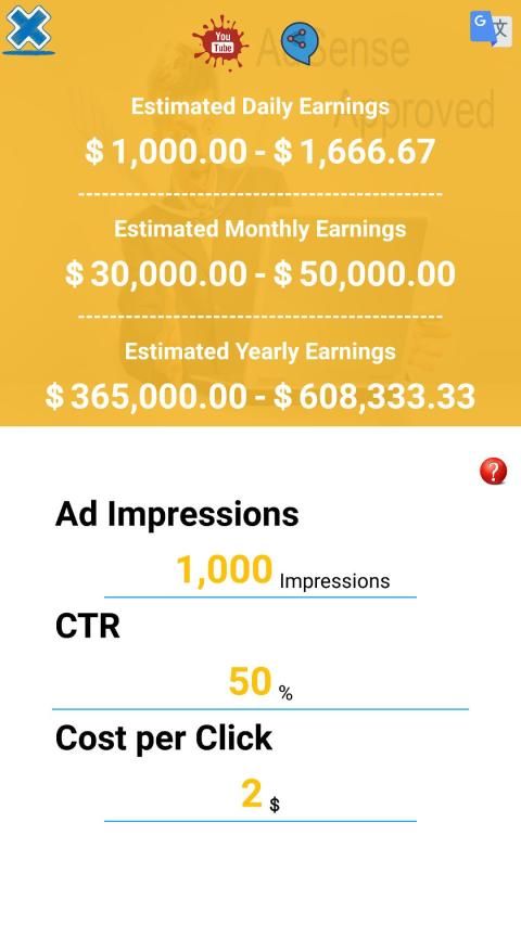 Kalkulator AdSense kami membantu pengguna Google AdSense memahami apa yang mempengaruhi potensi pendapatan mereka memungkinkan pengguna untuk bereksperimen dengan nilai-nilai: