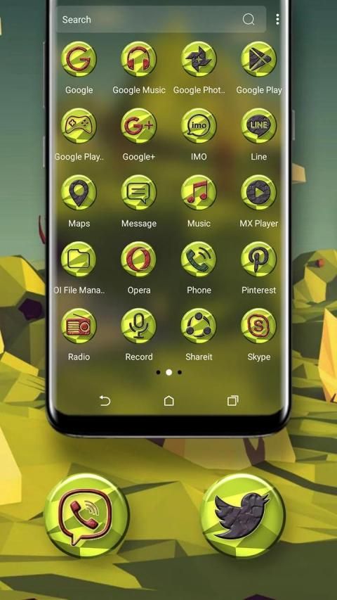 • Green Art Polygon Theme included many HD customized Icons of popular apps, social app like (Snapchat,imo,viber,twitter etc) System app icons.