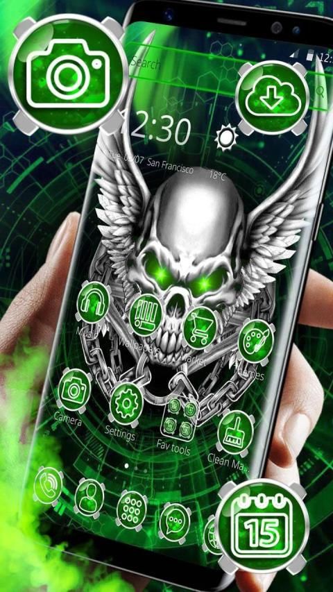 Tampilan Baru - Coba Tema Green Metallic Skull untuk memberikan tampilan baru ke ponsel android Anda.
