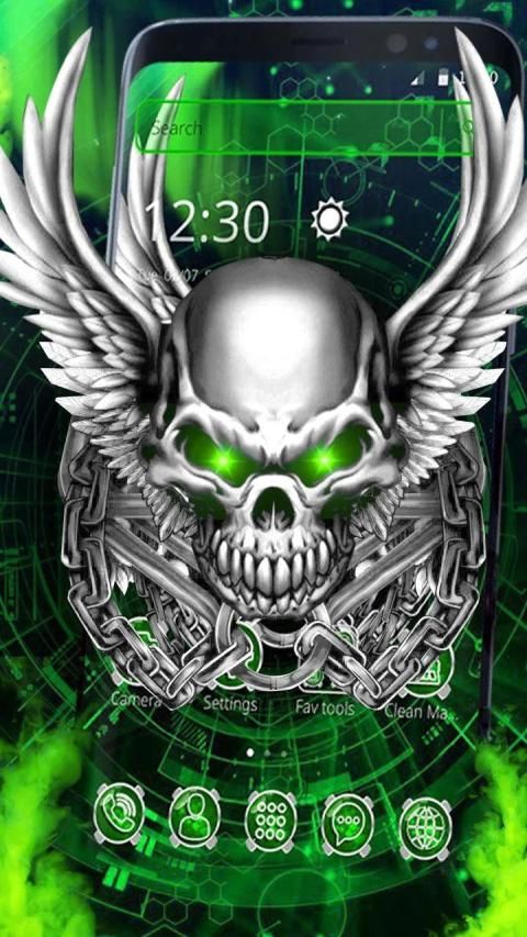 Lebih Banyak Ruang - Green Metallic Skull Theme hanya mencakup sebagian ruang ponsel Anda dan menjaga ponsel Android Anda aman dari virus.
