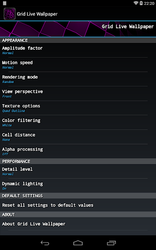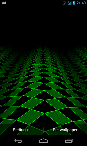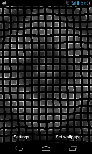 Grid live wallpaper displays a square matrix of animated cells. From the settings menu you can adjust the amplitude factor, motion speed, rendering mode, distance between cells; choose different textures, different perspectives; apply color filtering and alpha processing.