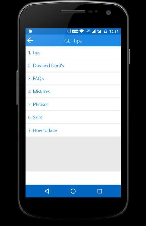 Kelompok Diskusi (GD) adalah bagian paling penting dan bulat untuk setiap kriteria seleksi dalam organisasi. Ada beberapa kategori dari mana calon mendapatkan topik mereka GD Putaran. Sebagian besar calon tidak berbicara karena kurangnya pada ide-ide tentang topik tersebut. Jadi Berikut adalah aplikasi untuk memecahkan masalah ini. Aplikasi ini akan membantu orang yang berbeda dalam wawancara. Aplikasi ini juga baik untuk posting pikiran Anda pada topik. Ada beberapa poin yang harus dilakukan sebelum menghadapi Group Discussion yaitu Group Discussion Tips. Kami telah menambahkan banyak tips.