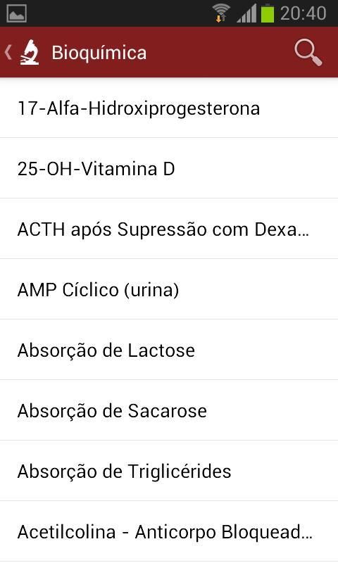 Semua tes dibagi ke dalam kategori: Biokimia, Hematologi, Mikrobiologi, Parasitologi dan Imunologi, dan pengguna masih memiliki tersedia kemungkinan untuk menggunakan pencarian untuk menemukan ujian tertentu.