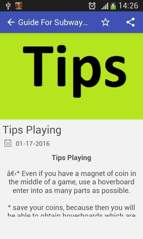 This is a subway surfers for the surfers Guide This is a subway surfers for the surfers guide to learn how to play and to obtain of coins and keys application guide, can help you win and obtain better notes this guide also gives you a way to make surfers characters of unlimited subway now and you will have the unlimited key and parts of Surfers unlimited subway direct surfers to subway, will help you in all your businesses, end-to-end guide of victorious surfers are the secrets, the Hidden levels, advice, the description, of passage and so much more than simply without that it does not become the best surfers of the world now You can with this app.