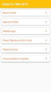 Guide for NBA 2K14 contain Basics Guide, Signature Skills, Walkthrough, Player Signatures Skills Lists, Players Scores, Acheivements & Trophies