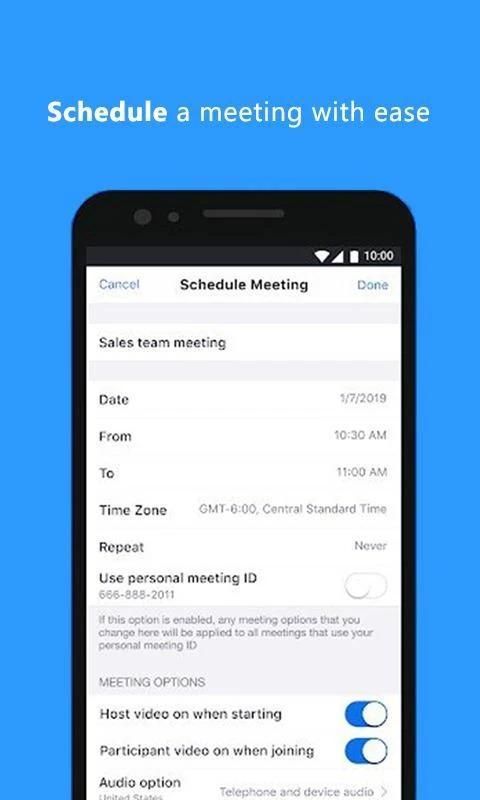 Aplikasi rapat zoom membantu orang untuk melakukan pertemuan di seluruh dunia dengan grup yang berkualitas tinggi. Fitur utama kunci aplikasi rapat zoom adalah kualitas pertemuan video android terbaik, kualitas berbagi layar Android terbaik, bekerja melalui Wifi, jaringan 4G / LTE dan 3G, status ketersediaan kontak, dll.