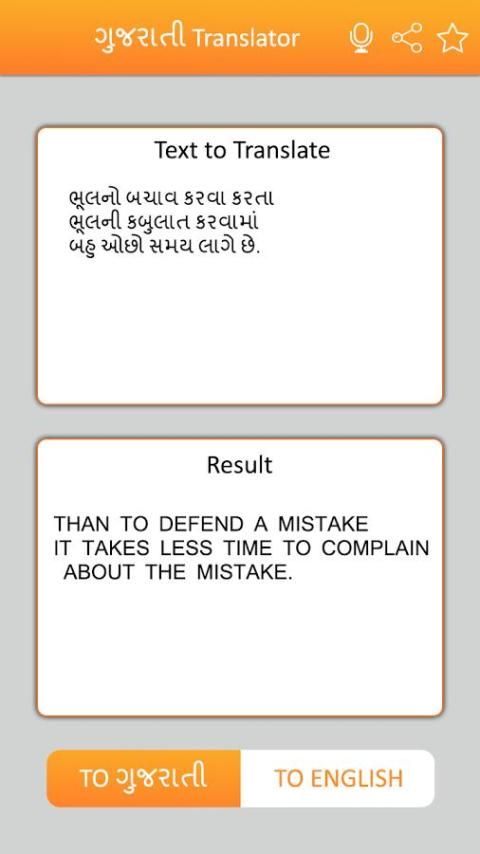 Ini Gujrati English Translator dapat dengan cepat menerjemahkan dari Gujrati ke bahasa Inggris dan bahasa Inggris untuk kata-kata Gujrati serta kalimat lengkap.