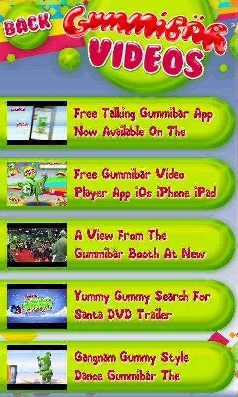 Ini fitur semua video yang diposting di saluran resmi YouTube Gummibär termasuk "I Am A Gummy Beruang (The Gummy Beruang Lagu)", "Nuki Nuki", "Pergi Untuk Tujuan", "Mr. Pak Gummibär" dan banyak lagi.