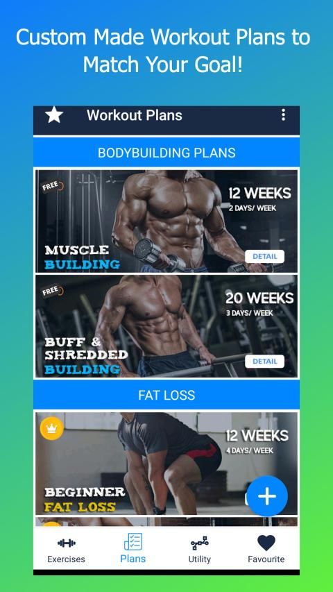 Ada banyak Rencana Latihan termasuk seperti membangun otot, buff & bangunan robek, Kehilangan Lemak Pemula, Kehilangan Lemak Otot, Kehilangan Lemak Perut, Kehilangan Lemak Perut Cepat, Otot Penguatan Berat Badan, Perolehan Cepat, Abs Perolehan Awal, Abs Perolehan Lebih Kuat, Perolehan Lem Lebih Kuat , Penguatan Dada Kuat, Pemula, Menengah & Meningkat Powerlifting.
