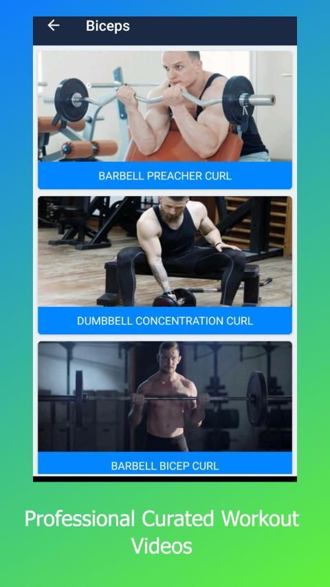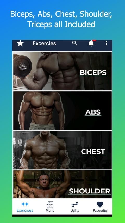 Exercise Types Included: Biceps Workout, Six Pack Abs Workout, Chest Workout, Shoulder Workout,Triceps Workout, Forearms Workout, Back, Cardio, Calves Workout.
