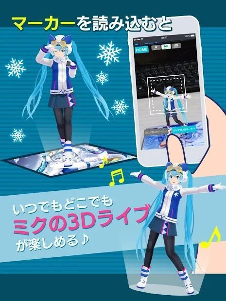 "HATSUNE MIKU AR" is an application which you can watch various images/movies such as Hatsune Miku's 3D virtual concert, using AR markers set in various places.