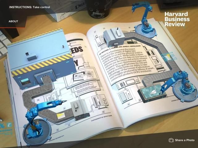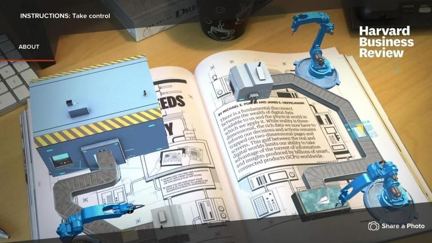 Pengalaman augmented reality saat Anda menjelajahi November-Desember 2017 Artikel HBR “Mengapa Setiap Organisasi Strategi Augmented Reality,” oleh Michael Porter dan James Heppelmann. Cukup buka majalah untuk ilustrasi AR-enabled artikel ini, arahkan perangkat mobile Anda, dan menonton grafis datang untuk hidup. Jika Anda tidak memiliki majalah, Anda dapat men-download artikel langsung dari aplikasi. Bergerak dan memiringkan perangkat Anda untuk melihat kemampuan AR dalam aksi: Perhatikan animasi X-ray pandangan unit tenaga hidrolik, lihat petunjuk langkah-demi-langkah untuk perbaikan, dan mengontrol lengan robot dengan layar sentuh Anda.